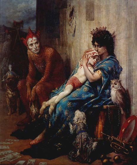 致命的な怪我をしたのだろう、子供は既に血の気も失せ、母親はなすすべもなくその子を抱いている。男もただ見守るだけだ。さらに傍らのフクロウが子供の死を暗示しているようで不気味である。
