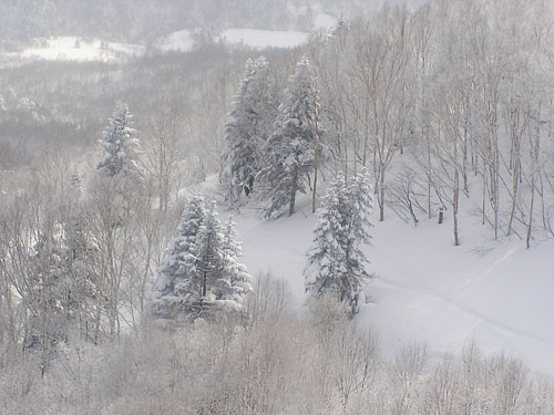 冷気に包まれて、木々が静かに立っています。