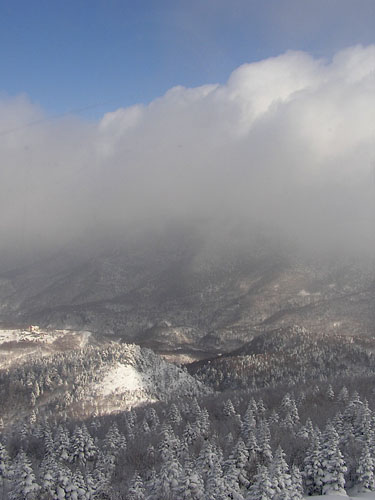 雪雲のカーテンが引いていくと、雪化粧を終えた森と青空が現れてきました。