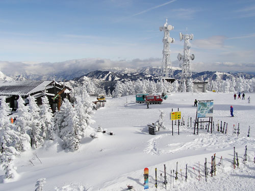 横手山の山頂。画面中央に見える雪上車がかわいいです。この後、左手に見える横手山頂ヒュッテで食事をしました。ヒュッテを出たときにはすっかり曇り、雪がちらついていました。山の天気は変わりやすいですね。